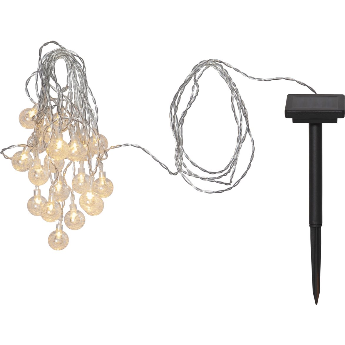 Solcellsdriven ljusslinga med små genomskinliga kulor med luftbubblor inuti. Slingans separata panel har ett uppladdningsbart batteri som laddas av solljus. Batterislingan placeras i skuggan och panelen på soligt ställe. Kabellängd 200 cm.